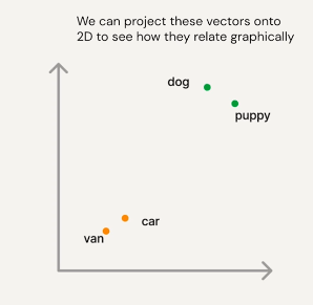 The closer the vectors, the higher their similarity. For example, 'dog' and 'puppy' would be closely positioned in a vector database, indicating their close relationship. On the other hand, 'dog' and 'van' would be set further apart, reflecting their relative, low similarity.