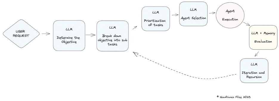 Objective Determination: Upon receiving a user's request, the autonomous agent platform employs a Large Language Model (LLM), such as GPT-4, to interpret and understand the user's intent.