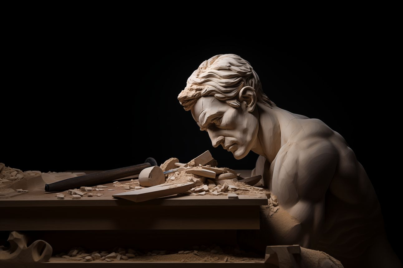 Midjourney Prompt: "Sculpted by Doubt": A sculpture half-finished, with tools of doubt chiseling away to reveal the figure of a bold and noble adult, unshielded in the face of suffering, showing the work and effort it takes to shape one's identity and future. Neoclassicism --ar 3:2
